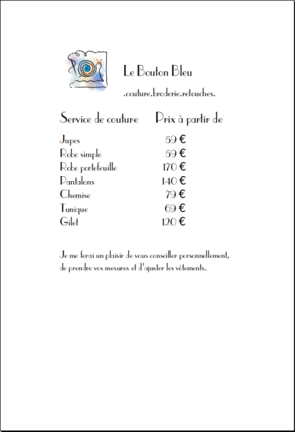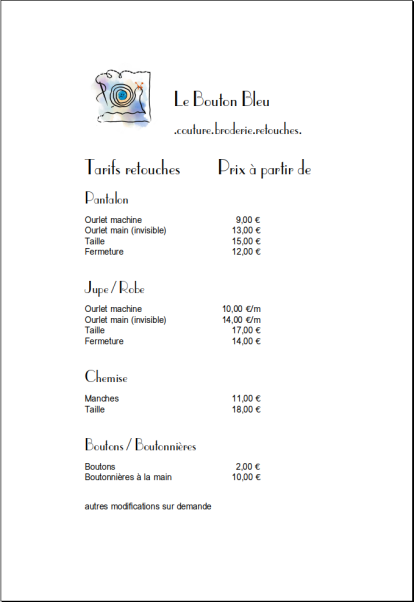 Vous trouverez les tarifs pour de la couture ci-dessous.